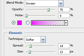 V novem oknu določite Blend Mode na Screen, Opacity 75 %, Noise 0 %. Technique določite Softer, Spread 14 % in Size 13 px. Preko izbirnika določite svetlo vijolično barvo. Ne zaprite še okna... |