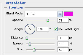 Blend Mode določite Normal in Opacity 75 %. Angle določtie 120 stopinj, Distance 3 px, Spread 13 % in Size 59 px. Preko izbirnika določite svetlo vijolično barvo. Potrdite spremembe na gumb OK. |