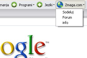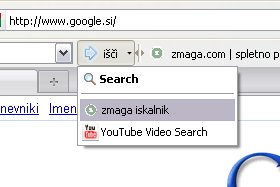 Na orodni vrstici imate gumb išči in zraven njega puščico usmerjeno navzdol. Kliknite nanjo... Pokazali se vam bojo iskalniki, ki so na voljo: Search (google.com iskalnik), zmaga iskalnik (iskalnik, ki išče po zmaga.com) in YouTube Video Search, ki sem ga dodal kar tako (mogoče vam bo kdaj prišel prav). Iskalnike menjate s klikom na iskalnik, ki ga želite imeti v uporabi. |