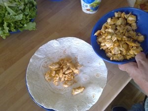Sedaj pripravite prvo tortiljo in vanj dodajte nekaj mesa.