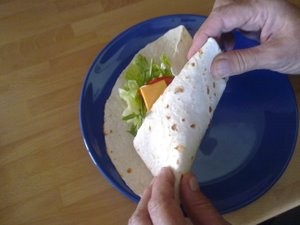 Sedaj pa tortiljo prepognite in zavijte, kakor je razvidno na sliki. |