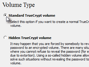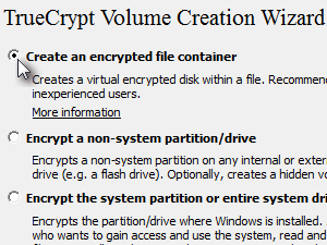 Šifriramo lahko obstoječe particije, lahko pa tudi sistemsko particijo. Najlažja izbira pa je, da bomo vse podatke shranili v eni šifrirani datoteki, zato izberemo možnost Create an encrypted file container. |