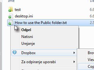 ![]() Če znotraj tem mape kliknete z desnimi miškinim gumbom, se postavite v podmeni Dropbox ... |