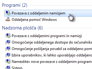 ![]() Med najdenimi rezultati izberemo Povezava z oddaljenim namizjem. |