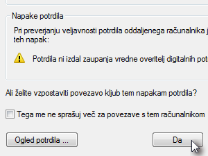 ![]() Ob povezovanju dobimo še opozorilo, da povezava ni podpisana z zaupanja vrednim digitalnim potrdilom. |
