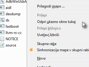 ![]() Sedaj pa nazaj na računalnik... Odprite mapo sdk v prej odprti mapi (adt-bundle-windows-(verzija)). Izberite platform tools. Sedaj pa hkrati pritisnite tipko Shift in desni miškin gumb. Izberite Odpri ukazno okno tukaj. Sedaj povežite vaš telefon s računalnikom s USB kablom. |