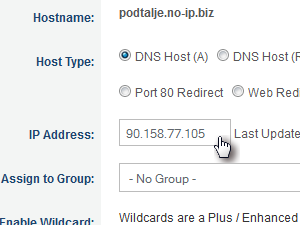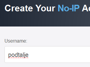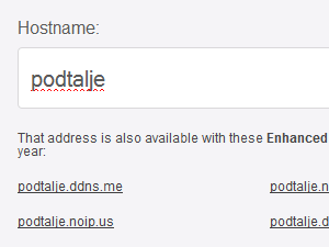 Izbrano ime predstavlja predpono naslovu no-ip.biz. Sam sem kot hostname izbral podtalje, torej bo ime moje domene podtalje.no-ip.biz |