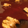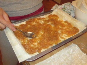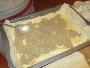 Vse skupaj pokrijte in potlačite z novim vlečenim testom ter ga ponovno premažite z tekočim maslom. Dodajte polovico orehovega nadeva in ga prav tako razporedite po celem vlečenem testu. |