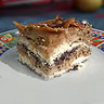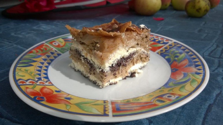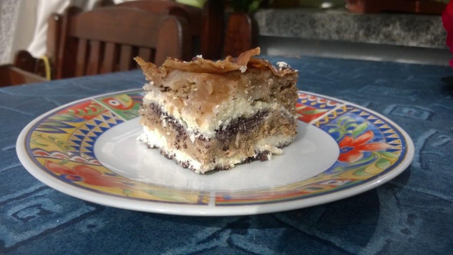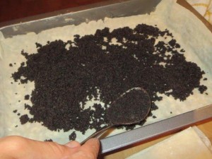 Na prvo nadstropje (oziroma pritličje) listnatega testa dodajte polovico makovega nadeva (glej sliko) ter ga lepo razporedite po celotni površini. |