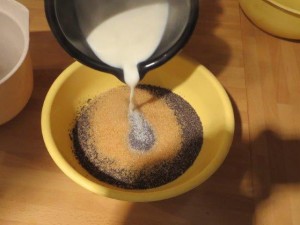 Vzemite lonec in vanj zlijte 1 deciliter mleka, katerega skuhate ter ga nato zlijete v posodo z makom in sladkorjem. |