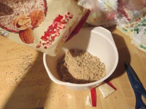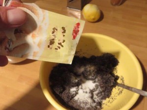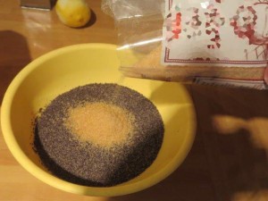 Pripravili bomo drug nadev, kjer bo glavna sestavina mak. V posodo stresite 200 gramov maka in nato dodajte še tri žlice sladkorja. |