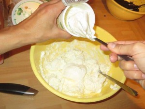 V isto posodo dodajte še eno jajce in vse skupaj dobro premešajte. Dodajte nato še polovico lončka kisle smetane. Drugo polovico kisle smetane bomo uporabili na koncu recepta. |