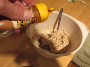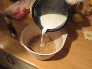 Skuhajte 1 deciliter mleka in ga zlijte v posodo z mletimi orehi. Nato pa dodajte še 1 vrečko vanili sladkorja in dve žlici sladkorja. |