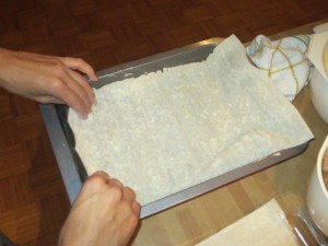 Začeli bomo s sestavljanjem. Vzemite pekač in ga z maslom v celoti premažite, da se sestavine ne bodo zapekle. Postavite na dno pekača vlečeno testo. Vlečeno testo sem kupil in je možno, da ga bo potrebno prej z nožem razrezati na tako velike kose, kakor je velik vaš pekač. |