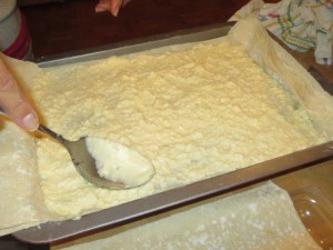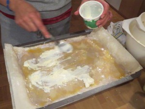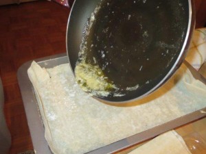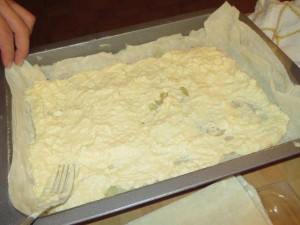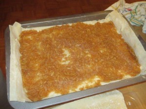 Še zadnjič pokrijte in potlačite z novim vlečenim testom ter ga ponovno premažite z tekočim maslom. Potem pa zgornjo polovico premažite z drugo polovico kisle smetane. V mojem primeru sem imel vlečenega testa preveč in je šel čez rob, zato sem ga z nožem odrezal. |