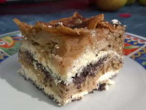 Spet ponavljamo posopek, kjer vse skupaj pokrijte in potlačite z novim vlečenim testom ter ga ponovno premažite z tekočim maslom. Dodajte drugo polovico makovega nadeva in ga razporedite. |
