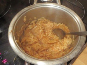 Postavite maso v posodo in jo postavite na kuhalno ploščo z nastavljeno srednje močno temperaturo ter čez čas začnite mešati, da postane nadev sočen oziroma bolj moker (glej sliko). Ko bo nadev sočen, odstranite lonec s kuhalne plošče. |