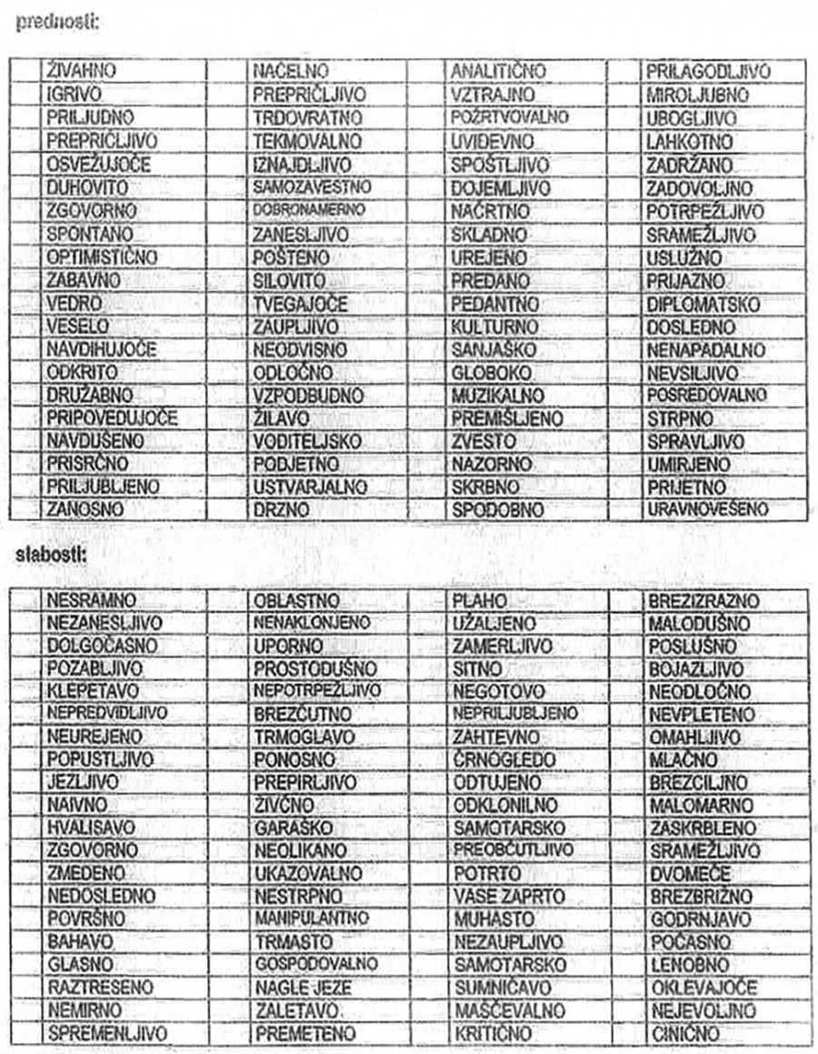3. Potem v vsaki vrstici označite en križec (vrstica ima štiri značaje iz leve proti desni).