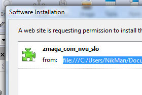 Kliknite na povezavo z desnim miškinim gumbom in izberite Shrani kot... Odprite program Nvu, nato kliknite zgoraj na Tools in izberite Extensions. Kliknite na gumb Install, v razskovalcu označite datoteko, ki ste jo shranili (zmaga_com_nvu_slo.xpi) in potrdite na gumb Open. Zaprite program Nvu in ga ponovno odprite, da bo prevod začel delovati. |