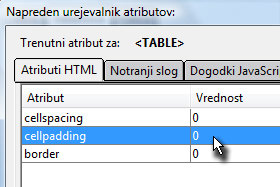 Prikaže se novo okno, kjer morate cellspacing in cellpadding določite vrednost na 0 (glej sliko).