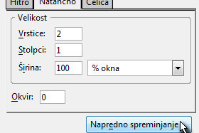 Odpre se novo okno, kjer kliknete na zavihek Natančno in nato v polje Vrstice vpišete 2 in Stolpci 1.