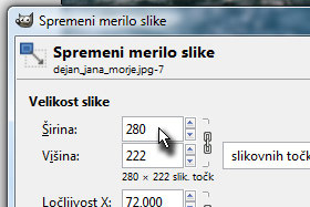 Kliknite zgoraj na Slika in izberite Spremeni merilo slike ... V novem oknu v polje Širina vpišite 280 in potrdite na gumb V redu. Porpocionalno se tudi polje Višina spreminja, potreben je le klik v to polje, da se vidi sprememba. |