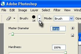 V orodni vrstici kliknite na puščico pri orodju Brush in nastavite Master Diamater, ki bo prilagojen vaši velikost fotografije. Jaz sem določil 14 pik, ker urejam fotografijo v manjši ločljivosti. |