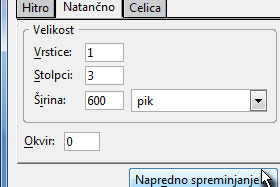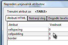 Prikaže se novo okno, kjer morate cellspacing in cellpadding določite vrednost na 0 (glej sliko).