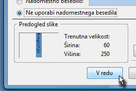 Nato pa v oknu vstavljanja slike označite Ne uporabi nadomestnega besedila in si zapomnite širino trenutne velikosti slike (glej sliko).