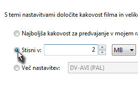 V novem oknu prvo označite polje Stisni v in določite željeno velikost posnetka v megabajtih (glej sliko).