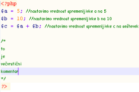 Spremenljivke se zapišejo tako: $imespremenljivke. Enovrstični komentar se zapiše: //komentar, večvrstični pa: