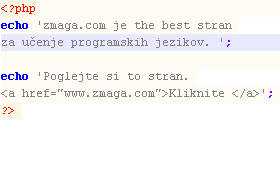 <?php echo 'zmaga.com je the best stran za učenje programskih jezikov. '; echo 'Poglejte si to stran. <a href="www.zmaga.com">Kliknite </a>'; ?> Datoteko shranimo na naš strežnik kot naprimer prvastran.php. Če si jo sedaj odpremo v brskalniku bo belo na črnem izpisano: zmaga.com je the best stran za učenje programskih jezikov. Poglejte si to stran. Kliknite |