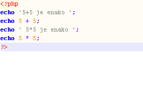 Poglejmo si primer. <?php echo '5+5 je enako '; echo 5 + 5; echo ' 5*5 je enako '; echo 5 * 5; ?> Izpisalo se bo: 5+5 je enako 10 5*5 je enako 25 |