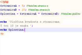 <?php $stranicaA = 5; //določimo stranico a $stranicaB = 10; //določimo stranico b $ploscina = $stranicaA * $stranicaB; //določimo ploščino echo 'Ploščina kvadrata s stranicama 5 ter 10 je enaka '; echo $ploscina; ?> Izpisalo se bo: Ploščina kvadrata s stranicama 5 ter 10 je enaka 50 |