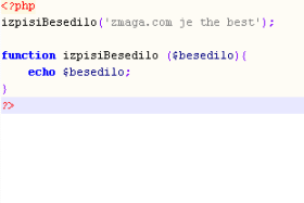 <?php izpisiBesedilo('zmaga.com je the best'); function izpisiBesedilo ($besedilo){ echo $besedilo; } ?> V začetku smo pognali funkcijo izpisiBesedilo in kot prvi argumenr določili besedilo zmaga.com je the best (kar tudi drži). Funkcija pa to besedilo tudi izpiše. Rezultat je izpisano besedilo. |