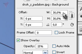 Odpre se okno z dodatnimi nastavitvami za orodje, ki služi kloniranju (Clone Stamp Tool). Prvo označite Show Overlay in Opacity določite na 15% (glej sliko). Ta nastavitev omogoča, da boste v "živo" videli, kaj klonirate in koliko naj bo velik procent vidnosti. Potem pa določite še W in H na 30% (glej sliko). S tem smo določili velikost kloniranega objekta na 30 procentov. |