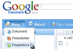 Odpre se vam novo okno ali zavihek, kjer kliknite na Nova in izberite Preglednica.