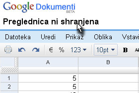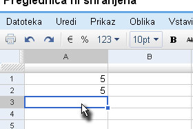 Sedaj pa z miško označite celici, kjer ste vpisali številki (glej sliko).