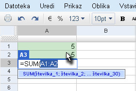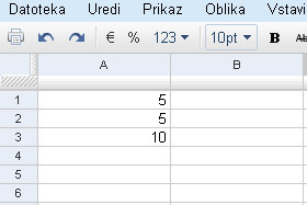 Mislim, da bi vam moralo biti okolje vsaj malo znano, če upravljate z Excel-om. Vpišite v celico A1 in A2 poljubni številki (glej sliki) in nato označite celico A3. |