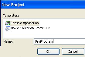 Odpre se novo okno New Project v katerem pod Templates (Vzorci) izberemo ikono Console Application. Na dnu okna napišimo še ime naše prve konzolne aplikacije, npr. Prvi Program.