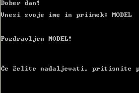 Znak pomeni da se od znaka naprej v konzoli napiše v novo vrsto. //Pozdravno sporočilo Console.Write("Dober dan! Vnesi svoje ime in priimek: "); //zahtevamo vnos podatkov preko tipkovnice. Vnos zaključimo z Enter string stavek=Console.ReadLine(); Console.WriteLine(" Pozdravljen " + stavek+"! "); |