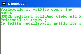 Če damo pred stavek // pomeni da je to samo komentar ki ga program ne prevede. //barva ozadja bo bela Console.BackgroundColor = ConsoleColor.White; //celo okno bo belo Console.Clear(); //barva pisave bo črna Console.ForegroundColor = ConsoleColor.Black; //napis na oknu Console.Title = "POZDRAVNO OKNO"; //zvočni signal, s frekvenco 1000 HZ, ki traja 500 milisekund Console.Beep(1000,500); |