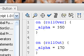 Pritisnite tipko F9 in in vnesite naslednjo kodo: on (rollOver) { _alpha = 350 } on (rollOut) { _alpha = 170 } |