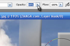 ![]() Zgoraj v orodni vrstici določite Opacity na okoli 44% (jakost čopiča). |