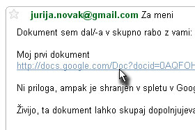Prejela bo e-pošto z obvestilom, da delite z njo dokument. Priložena je še povezava do dokumenta |