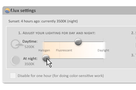 Pri meni trenutno ura ravno kaže polnoč. Če kliknete kamorkoli okoli te krivulje, se bo začel hiter, štiriindvajseturni predogled. Če spodaj kliknete na Disable for one hour, se vam bo f.lux onemogočil za eno uro. |
