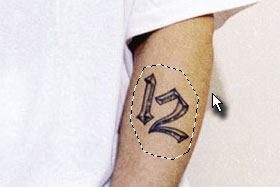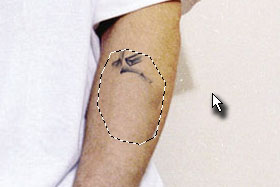 Izberemo Clone Stamp Tool, pritisnemo alt in izberemo "kožo" zunaj selekcije, ki je brez tetovaže.