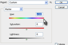 ![]() Sedaj pritisnite tipki Ctrl+U, da se vam odpre okno Hue/Saturation in nastavite Hue na +99. |