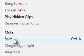 Če želite posnetek razpolovit, kliknite na mesto kjer ga želite razpolovit, nato kliknite desni miškin klik na posnetek, in izberite Split (bližnjica: Ctrl+K), da ga razpolovite.