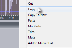 Označite želen del in pritisnite tipko DEL (delete/zbriši). Podobno lahko tudi kopirate ali premaknete del posnetka, tako da označite želen del in kliknete desni miškin klik in izberete Copy (skopiraj), Cut (izreži) ali pritisnete Ctrl+C (kopiraj), Ctrl+X (izreži). Nato greste do mesta, kjer želite prilepit del posnetka in kliknete desni miškin klik in izberete Paste (prilepi) ali pritisnete Ctrl+V (prilepi). |